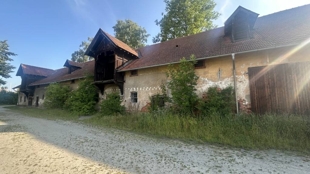 Der große Stadl mit Kreuzgewölben befindet sich in einem renovierungsbedürftigen Zustand. Das Gebäude hier steht unter Denkmalschutz und war von der Planung her vorgesehen mit einzufließen in die weitere Bebauung. Das Garagengebäude ist noch mit einem Eternitdach versehen. Hier sind derzeit 7 große Lkw Garagen vorhanden.