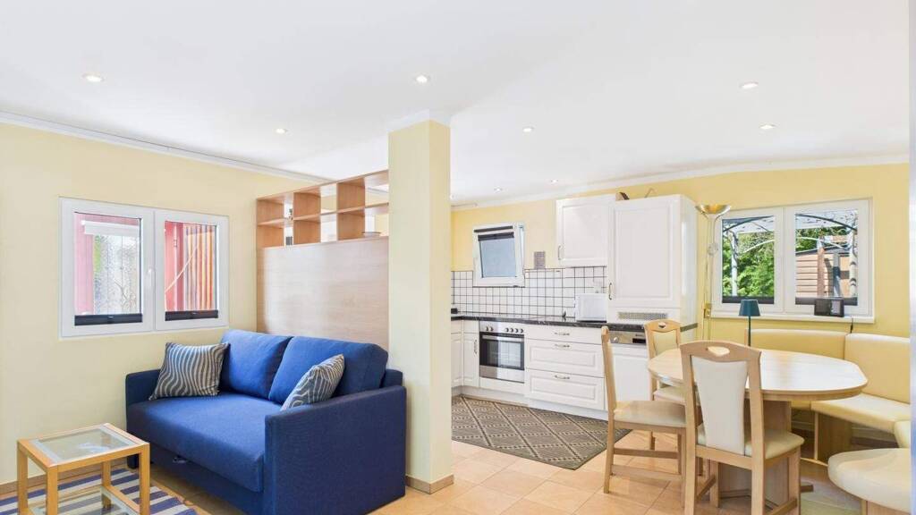 + teils abgetrennter Wohnbereich mit ausziehbarer Couch (160 cm breit) und Matratzentopper für erholsame Nächte