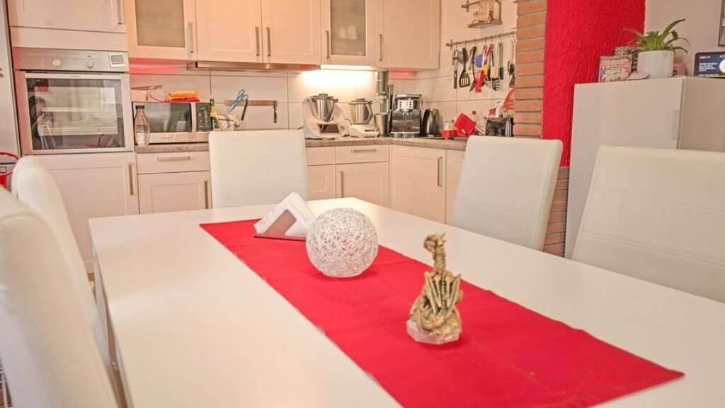 Das Erdgeschoss präsentiert eine große Wohnküche, Wohnzimmer, Bad mit Wanne, WC, Waschbecken und Waschmaschinenanschluss.