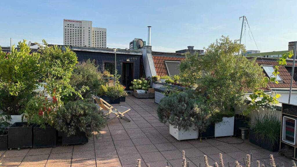 Die riesige Dachterrasse ist das Herzstück der Wohnung. Ob entspanntes Frühstück in der Morgensonne, gesellige Sommerabende mit Freunden oder einfach ein Moment der Ruhe über der Stadt - hier entsteht ein Lebensgefühl, das in Leipzig seinesgleichen sucht. Nicht einsehbar und mit vielen Pflanzen und kleinen Bäumchen liebevoll angelegt erleben Sie hier Freiraum und Privatsphäre auf ganz besondere Weise.