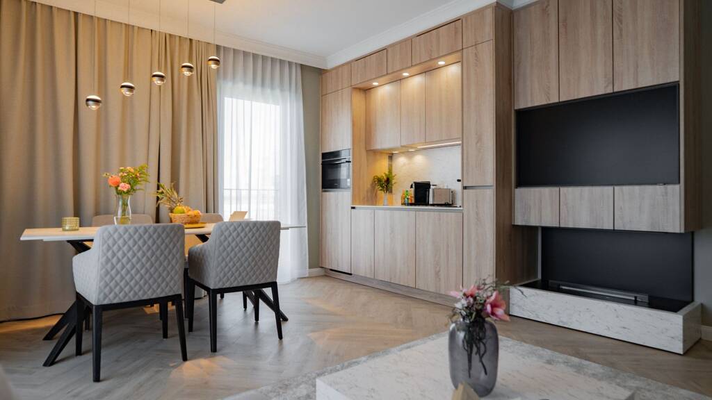 Zwei komfortable Schlafzimmer und zwei elegant ausgestattete Badezimmer – eines mit Badewanne, eines mit Dusche – gewährleisten Privatsphäre und Flexibilität. Das Herzstück bildet das Wohnzimmer mit direktem Zugang zum Staffelbalkon, von dem aus Sie einen unvergleichlichen Blick auf das Hafenbecken genießen können.