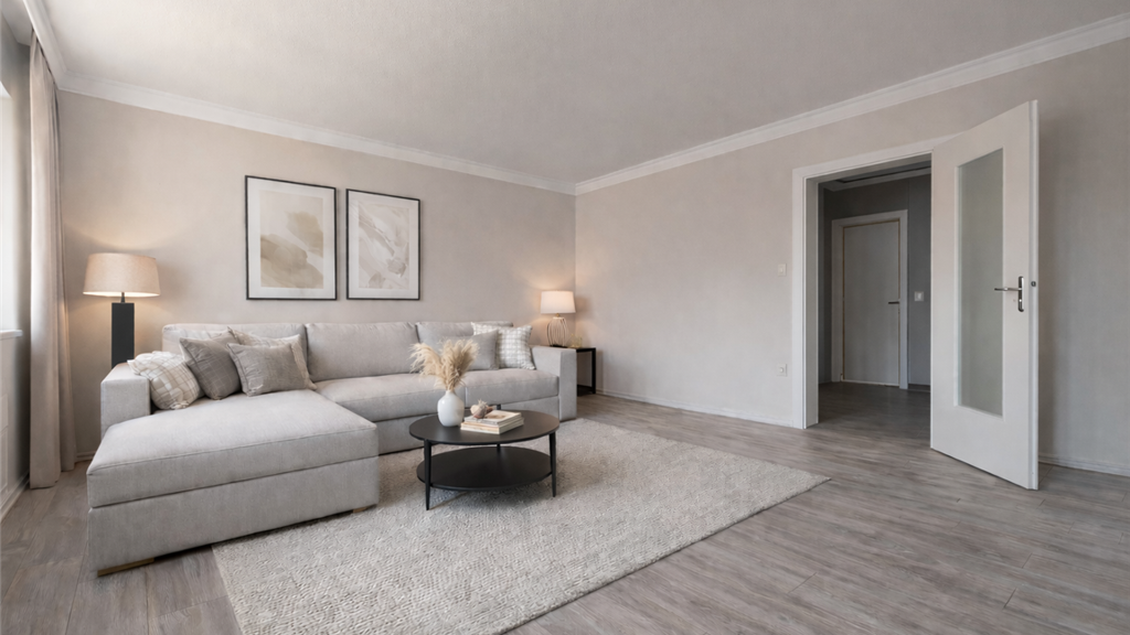Der durchdachte Grundriss umfasst vier gut geschnittene Zimmer, eine separate Küche, ein Badezimmer sowie ein Gäste-WC. Bereits beim Betreten empfängt Sie ein großzügiger Flur mit hochwertigem Feinsteinzeug, der einen angenehmen ersten Eindruck vermittelt und ausreichend Platz für Garderobe bietet.