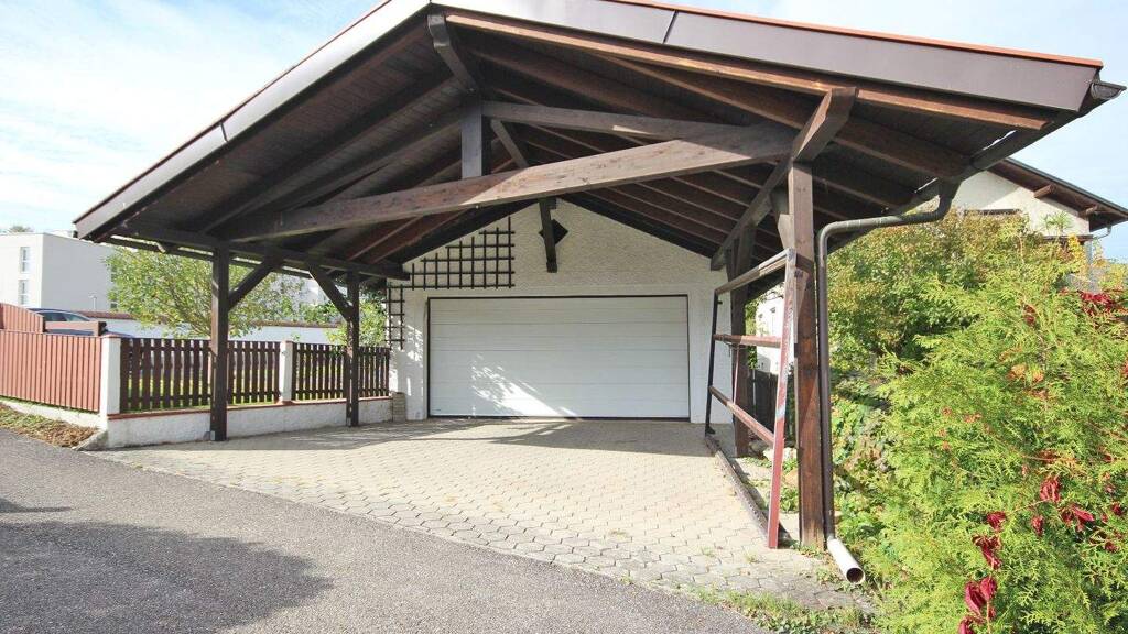 Abstellmöglichkeiten für Fahrzeuge bieten die freistehende Doppelgarage sowie das direkt an das Haus angeschlossene Carport. Zusätzlich steht Ihnen eine rund 35 m² große Gartenhütte als weiterer Stauraum zur Verfügung.