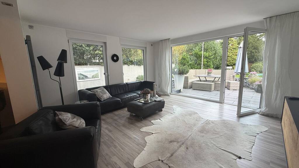 Ein besonderes Highlight ist der große, gepflegte Garten, der in dieser Gegend nur selten zu finden ist. Die hochwertig wirkende Terrasse sowie das große Wohnzimmerfenster schaffen einen einladenden Übergang zwischen Innen- und Außenbereich.