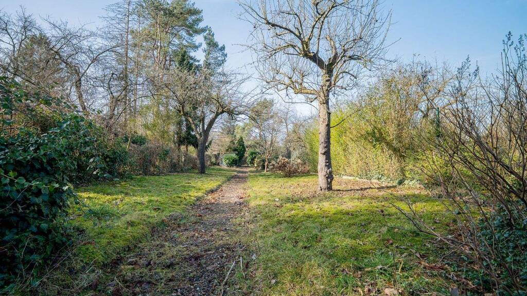 Auf der Parzelle ist ein Kieselweg angelegt, der derzeit teilweise von Laub bedeckt ist. Zudem befinden sich mehrere Obstbäume auf dem Grundstück, die dem Garten eine gewachsene und naturnahe Atmosphäre verleihen.