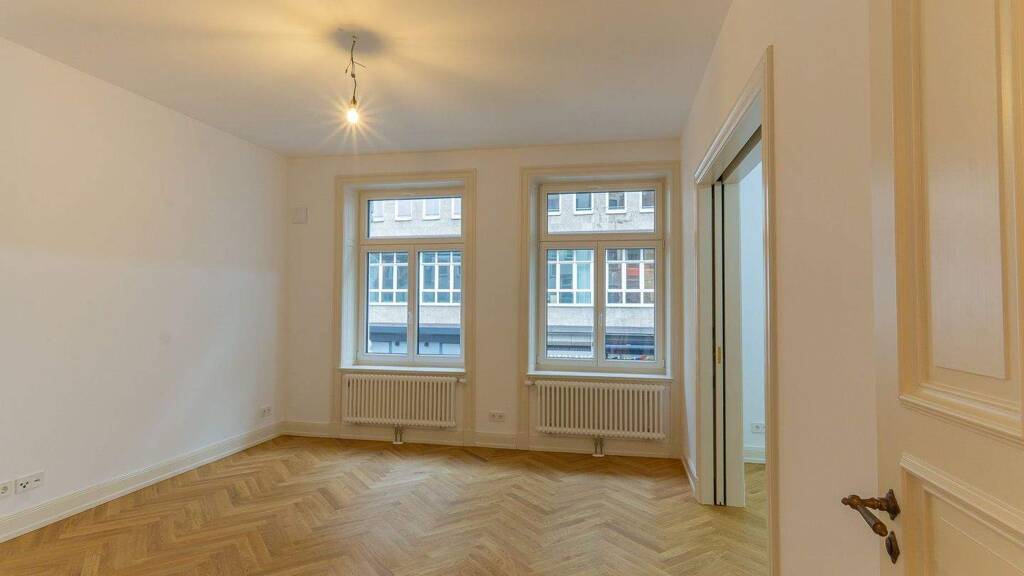 Rechterhand öffnet sich der Wohnbereich mit Wohn- und Esszimmer, die durch eine Schiebetür miteinander verbunden sind. Beide Räume sind zur Straßenseite ausgerichtet, sind dank der dreifach verglasten Fenster jedoch angenehm ruhig. Die großen Fensterflächen sorgen für viel Tageslicht und unterstreichen die warme Wirkung des Holzbodens. Besonders ins Auge fallen die liebevoll ausgewählten Details wie die dekorativen, historisierenden Türbeschläge, die den Räumen einen authentischen Gründerzeitcharakter verleihen. Die zahlreich vorhandenen Steckdosen ermöglichen eine flexible Möblierung und Nutzung der Räume. Zudem ist die Wohnung an das Glasfasernetz angeschlossen, was für eine sehr gute Internetanbindung sorgt.