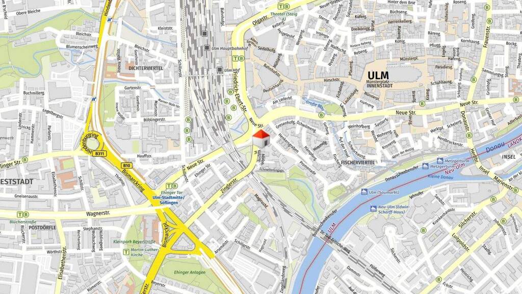 Die Ulmer City rund um den Münsterplatz, die Hirschstraße und das Dichterviertel ist in wenigen Minuten erreichbar und bietet ein lebendiges urbanes Umfeld mit hoher Aufenthaltsqualität. Gleichzeitig überzeugt der Standort durch eine schnelle Anbindung an die Bundesstraßen und Autobahnen, wodurch auch überregionale Termine bequem wahrgenommen werden können. Insgesamt verbindet die Lage am Adolph-Kolping-Platz 1 zentrale Urbanität mit optimaler Mobilität - ein Standort, der modernes Arbeiten inmitten der Stadt auf ideale Weise unterstützt.