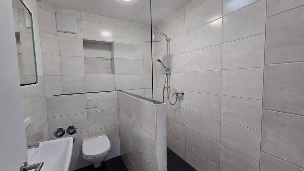 Das Badezimmer ist mit einer Dusche ausgestattet und verfügt über eine Dachluke, die für natürliches Tageslicht sorgt. Eine Einbauküche ist vorhanden; die Spülmaschine ist vom Mieter selbst mitzubringen.