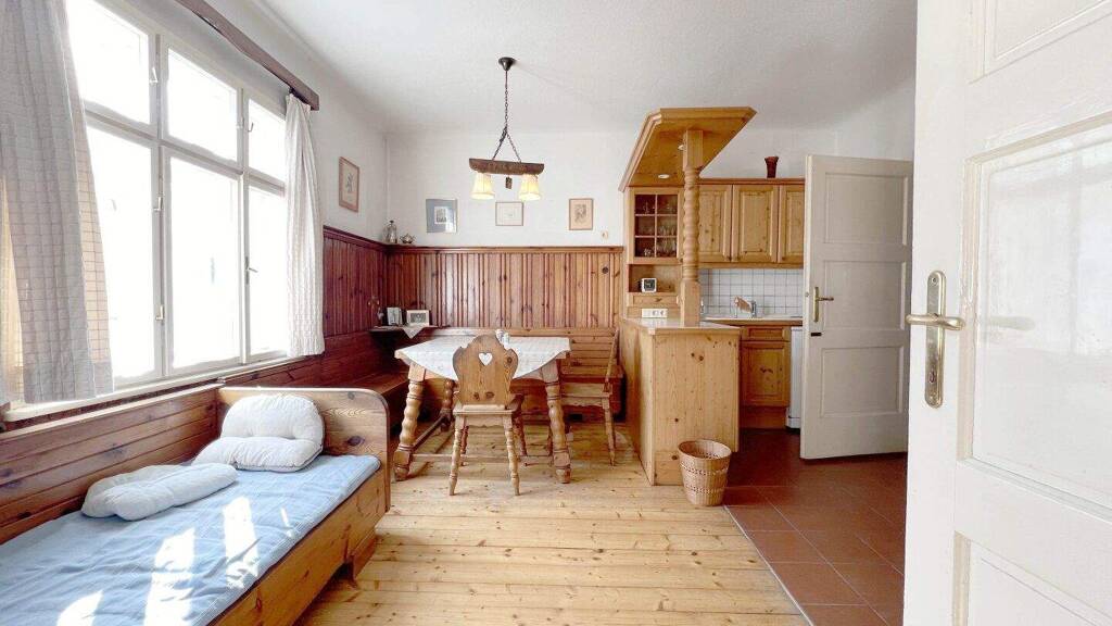 Im Erdgeschoß befinden sich ein Vorraum, ein Wohnzimmer, eine Küche im Landhausstil mit gemütlicher Sitzecke und erneuerten Küchengeräten, ein Badezimmer mit Dusche, Bidet und Waschmaschinenanschluss sowie ein separates WC.