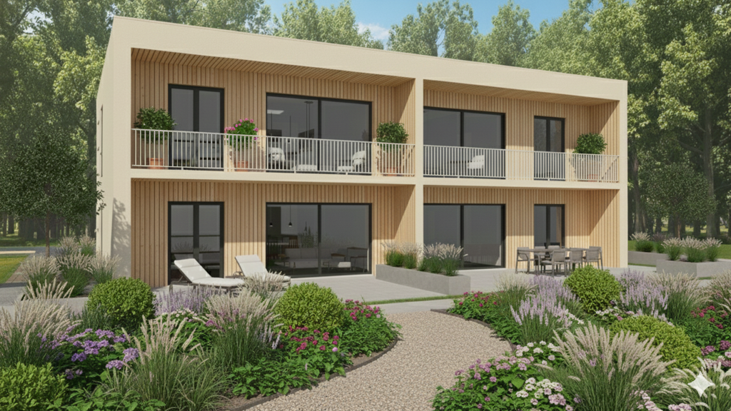 Geplant ist ein Mehrfamilienhaus mit je zwei Wohneinheiten im Erdgeschoss und im Obergeschoss. Die unteren Wohnungen verfügen über Terrassen, die oberen über Balkone. Der Garten wird für alle Parteien gemeinschaftlich nutzbar sein. Zwei Stellplätze für Fahrzeuge je Wohnung am Haus sind vorgesehen.