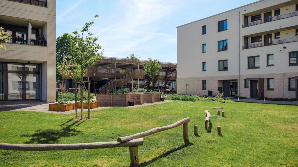 Im Außenbereich bieten großzügige Gemeinschafts-, Spiel- und Grünflächen Raum für Entspannung und geselliges Miteinander. Die Massivhäuser verfügen über die Energieeffizienzklasse KfW 55.
