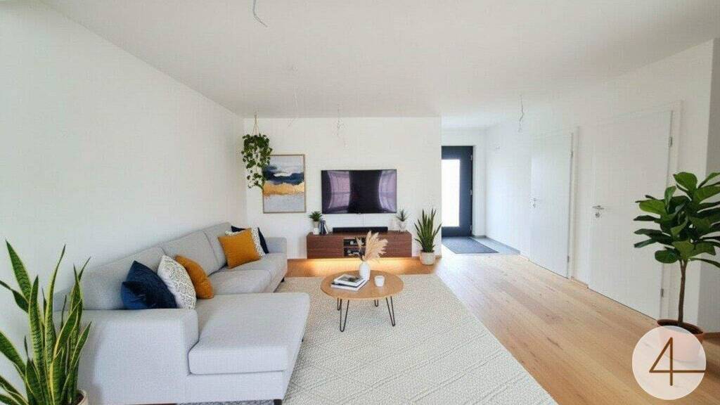 In der unteren Etage befindet sich ein geräumiges Wohnzimmer, das nahtlos in den Essbereich übergeht. Diese offene Gestaltung fördert die Kommunikation und schafft einen einladenden Raum für Familien und Gäste. In Ihrer zukünftigen Küche können Sie ideal für die Zubereitung von Speisen sorgen, und bietet gleichzeitig Zugang zu einer Terrasse mit Gartenbereich, der zum Entspannen und Verweilen einlädt. Große Fensterfronten sorgen für eine helle und freundliche Umgebung, während die offenen Wohnkonzepte sowohl Funktionalität als auch Stil vereinen.