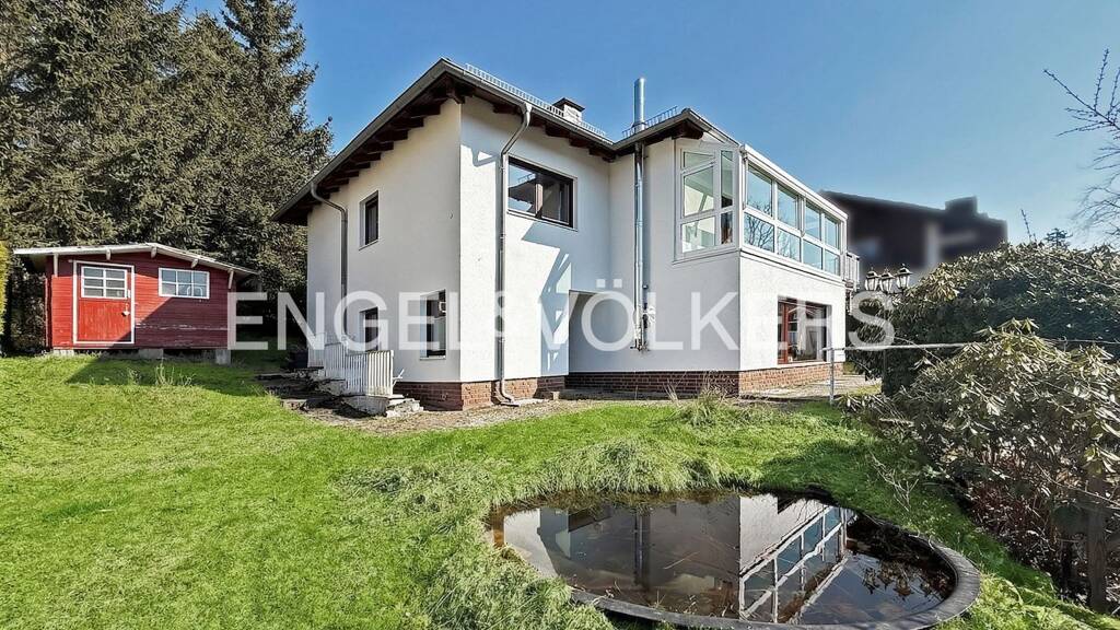 Das Erdgeschoss ist auf Offenheit und Geselligkeit ausgelegt. Der weitläufige, mit Parkett ausgestattete Wohn- und Essbereich bildet das Zentrum des Hauses. Ein hochwertiger Kamin sorgt hier an kühlen Abenden für wohlige Wärme und ein gemütliches Beisammensein mit der Familie oder Freunden. Von hier aus gelangen Sie über die nach Südwesten ausgerichtete Terrasse in den großzügigen Garten mit kleinem Teich und einer Gartenhütte. Die offene, moderne Einbauküche erlaubt den Kontakt zu Gästen auch während der Zubereitung der Speisen. Ein praktischer Abstellraum sowie ein Gäste-WC runden das Erdgeschoss sinnvoll ab.