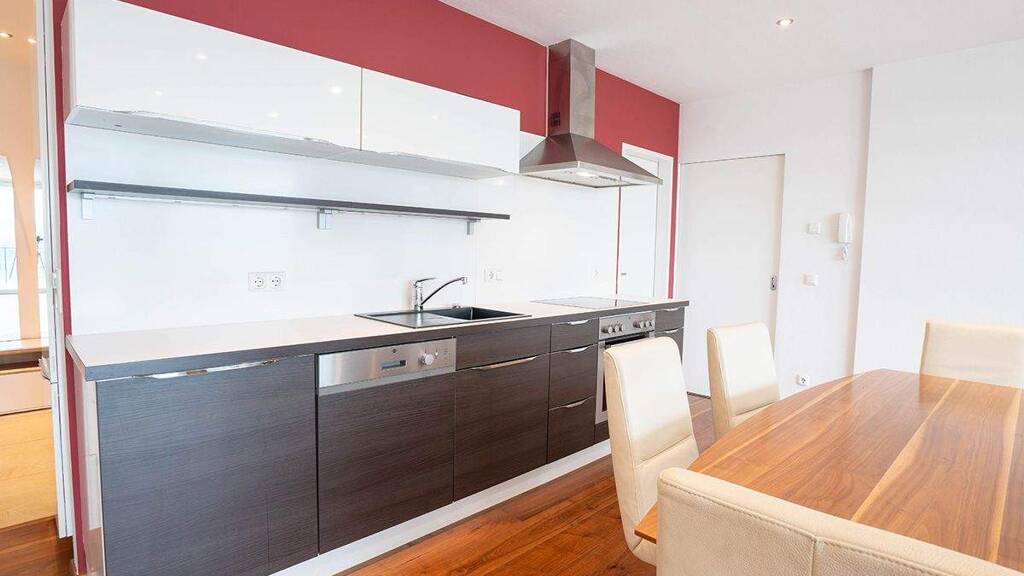 Der helle Wohn- und Essbereich ist offen gestaltet und wird durch große Fensterfronten mit Licht durchflutet. Die moderne Küche mit separater Speisekammer bietet reichlich Stauraum und Komfort.