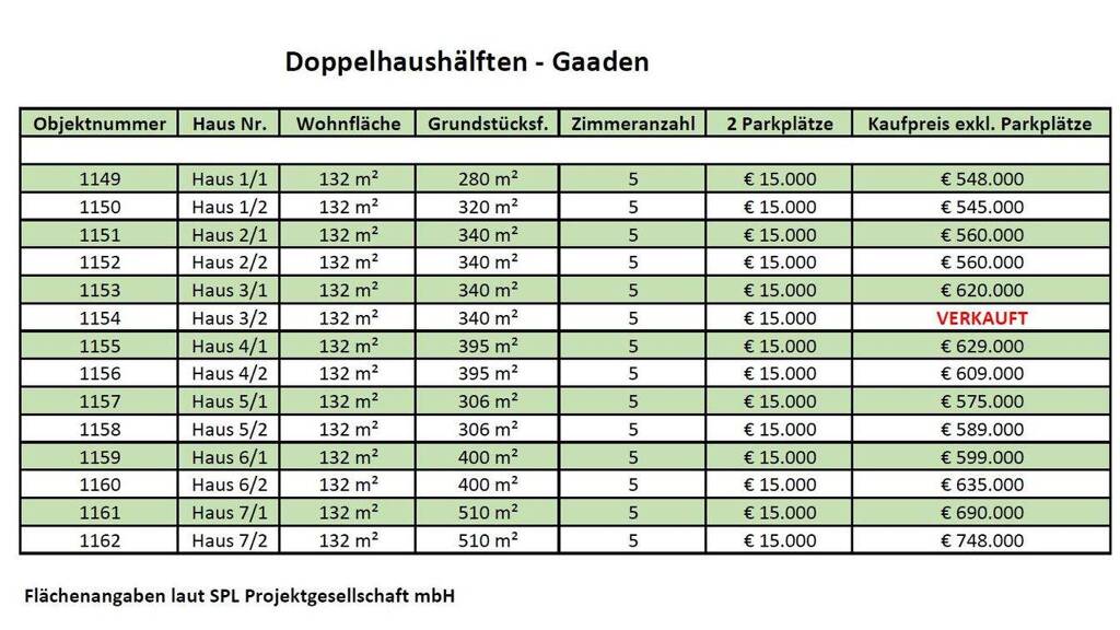 Zu jeder Doppelhaushälfte gehören zwei KFZ-Stellplätze, die für 15.000 € dazugekauft werden müssen.
