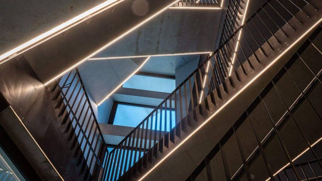 Der T-förmige Baukörper wurde so konzipiert, dass er die städtische Umgebung aufnimmt und gleichzeitig ruhige, grüne Rückzugsorte schafft. Ein markantes, mäanderförmiges Fensterband zieht sich in fließenden Linien über die Fassade und sorgt für außergewöhnliche Lichtverhältnisse in den Innenräumen.