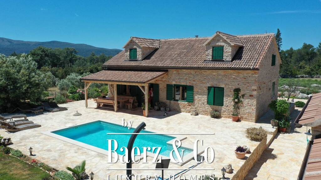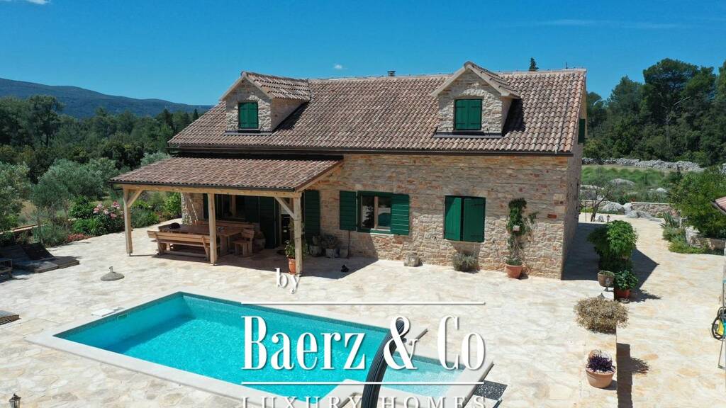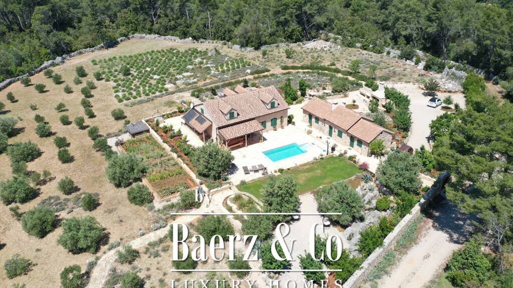 phvar, a traditional mediterranean villa, located on a large plot of 8500 m2, in a unique location surrounded by natural landscapes. the property consists of one main building, three auxiliary and swimming pool and landscaped garden. the main house spreads over two floors, with a total area of 220 m2. on the first floor there is a kitchen, dining room and living room with open floor plan, two bedrooms with bathrooms and one toilet. the upper floor is accessed by a beautiful internal staircase, where there are two additional bedrooms, each with a bathroom./ppof the three ancillary facilities in the row, the first has a large dining table, kitchen and fireplace. the other serves as a laundry room and has one bathroom. the third is a comfortable bedroom with its own bathroom. in front is a large pool./ppthe main advantage of this property is certainly the landscaped garden with rich horticulture that is carefully maintained. over 100 olive, lavender, rosemary, citrus and immortelle trees./ppthe whole building is air conditioned and solar panels are installed./ppthe property also has a basement where a wine shop can be arranged./ppconstruction of the villa began in 2010 and was completely completed in 2016. arranged according to the natural ambience of the location. all infrastructure is present (water, electricity, septic tank, access road)./ppthe villa is located on the north side of the island of hvar, near stari grad and vrboska./ppthis type of property is truly unique on the market and is ideal for all lovers of peace and solitude, only 800 m from the sea./ppother information on request./p