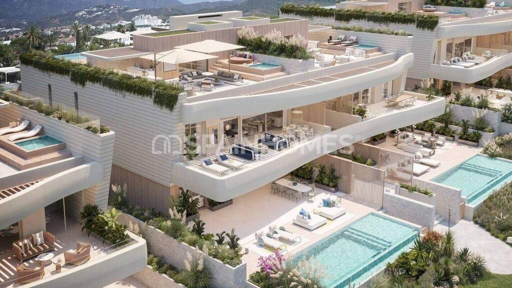 Kurzbeschreibung Die erstaunlichen Wohnungen befinden sich in Marbella, Costa del Sol, die sich in einem luxuriösen Komplex mit Einrichtungen für die Bewohner wie Schwimmbäder, Gärten und ein Spa befinden. Objekt Stilvolle Wohnungen mit zeitgenössischem Design in einem luxuriösen Komplex am Strand von Marbella