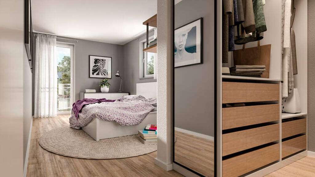Auch im Obergeschoss wird moderner Wohnkomfort großgeschrieben. Während im geräumigen Wohnzimmer alle zusammenkommen, bieten drei weitere Zimmer einen individuellen Rückzugsort. Ausreichend Stauraum ist dank eines Abstellraums im Flur und einer Ankleide im Schlafzimmer gewährleistet.