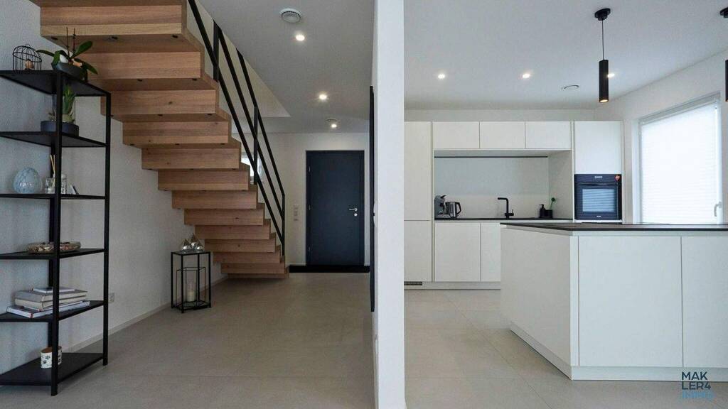Im Erdgeschoss erwartet Sie ein offener Wohn-, Ess- und Küchenbereich mit viel Tageslicht und direktem Bezug zum Außenbereich. Ergänzt wird diese Ebene durch eine Diele mit Garderobenbereich, ein Duschbad sowie praktische Nebenflächen. Im Obergeschoss stehen mehrere gut geschnittene Zimmer sowie ein modernes Hauptbad zur Verfügung.