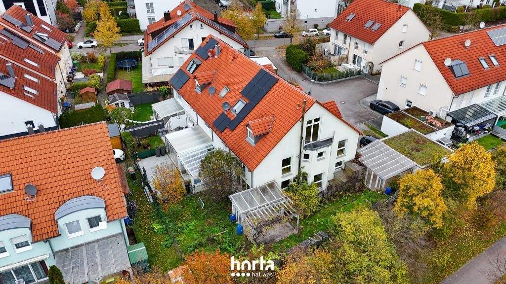 Das Reihenendhaus mit Südwestgarten und Carport wurde 1999 erbaut und ist Teil einer gepflegten Häuserreihe mit fünf Einheiten. Die ruhige Lage mit Blick ins Landschaftsschutzgebiet schafft eine naturnahe Wohnatmosphäre.