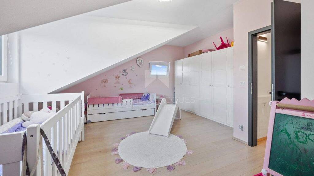 Über eine elegante Treppe gelangst Du ins Dachgeschoss. Hier erwarten Dich zwei großzügige Schlafzimmer. Das Kinderzimmer ist mit einer Dachgaube ausgestattet, die für eine angenehme Lichtstimmung sorgen. Das luxuriöse Masterbad bietet Dir eine freistehende Badewanne, eine große Regendusche, ein Doppelwaschbecken und ein WC - ein echtes Wohlfühlbad.