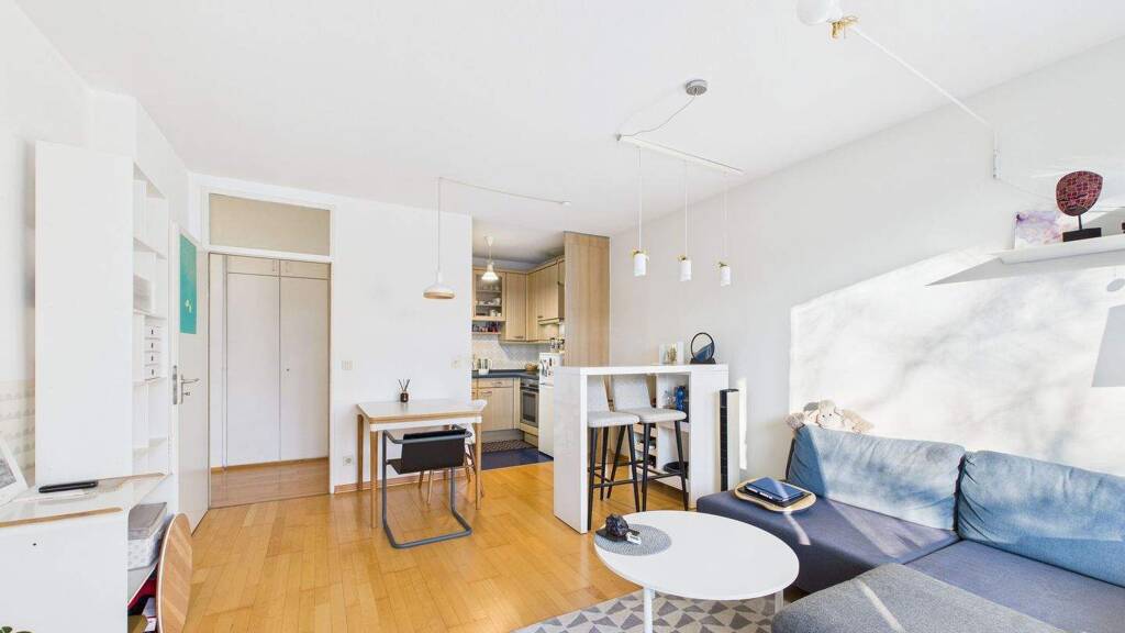 Der durchdachte Grundriss schafft eine angenehme Wohnatmosphäre auf überschaubarer Fläche. Der offen gestaltete Wohn- und Essbereich mit integrierter Küche bildet den Mittelpunkt der Wohnung und wirkt freundlich und einladend. Das separate Schlafzimmer bietet ausreichend Platz für individuelle Gestaltung. Die vorhandene Möblierung ist geschmackvoll gewählt, sodass die Wohnung ohne weiteren Aufwand direkt bezogen oder vermietet werden kann.