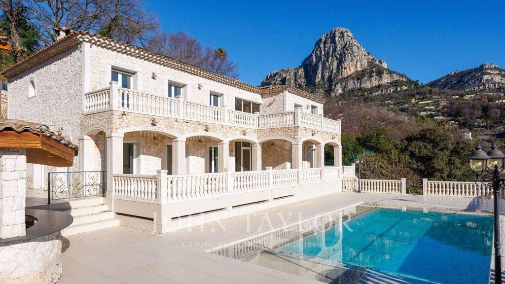 Implantée sur un terrain paysager et entièrement clôturé de 3 065 m², elle bénéficie d'une vue dégagée sur les Baous, la forêt et d'un aperçu mer.