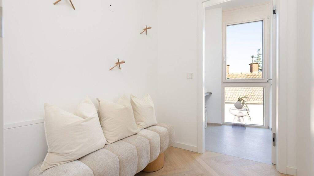 Der französische Chic des Namens spiegelt sich auch in der Auswahl der Materialen wieder. Formschöne Eleganz bei hochwertigem Parkett (Fischgrät Optik) trifft großformatiges Feinsteinzeug sowie durchdachte Lichtplanung, gesundheits- und raumklimabewusste Wandgestaltung (Lehmputz in den Schlafbereichen), zukunftsweisende Kühlung und Heizung (Luftwärmepumpe) und generelle stimmige, zeitlos elegante Ausführung im Designkonzept und überhohe Türen.