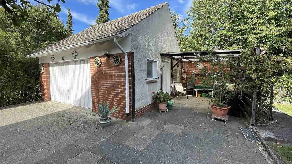 Das Grundstück umfasst ca. 712 m² und ist mit Obstbäumen und pflegefreundlicher Bepflanzung angelegt. Erbaut wurde das Haus 1964 und bedarf einer Verjüngungskur. Eine Doppelgarage und ein PKW-Stellplatz vor dem Haus runden das Angebot ab.