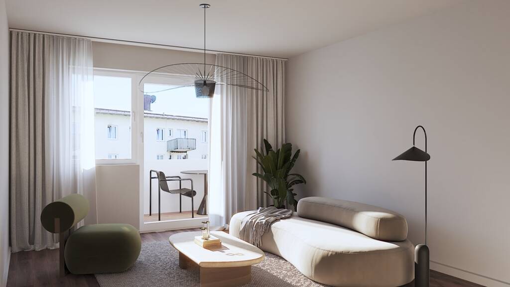 Das Wohnzimmer beeindruckt mit seiner hellen und freundlichen Atmosphäre. Die kompakte, funktional gestaltete Küche fügt sich harmonisch in den Wohnbereich ein. Das ruhig gelegene Schlafzimmer bietet einen behaglichen Rückzugsort zum Entspannen. Von hier aus gelangt man direkt auf den Balkon, der zum Verweilen im Freien einlädt. Zwei weitere Zimmer lassen sich flexibel als Kinderzimmer, Arbeitsbereich oder Gästezimmer nutzen - ganz nach den individuellen Bedürfnissen. Das helle Tageslichtbad rundet das Raumangebot ab und schafft eine angenehme Wohlfühlatmosphäre.