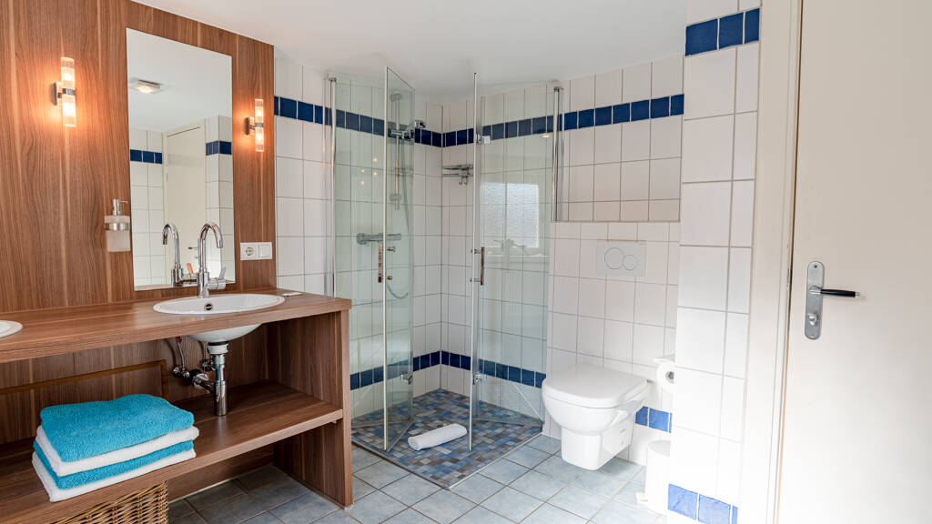 Ăśber eine stilvolle Holztreppe gelangen Sie in das Obergeschoss, wo eine groĂźzĂĽgige, offiziell zur Ferienvermietung genehmigte, 4-Zimmer-Wohnung auf Sie wartet. Diese besticht durch ein helles Wohnzimmer mit Erker und gemĂĽtlichem Holzkamin, eine separate KĂĽche mit Essbereich sowie drei komfortable Schlafzimmer und zwei Badezimmer.