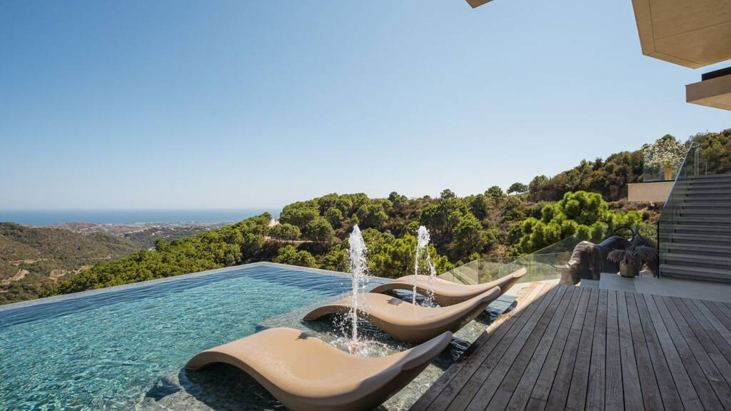 Neue versteckte Juwelenvilla in Monte Mayor, Benahavís. Geschlossene Wohnanlage mit atemberaubender Natur, Privatsphäre und Meerblick. Luxushaus von 1100 m² mit großen Terrassen auf einem Grundstück von 5.127 m². Nachhaltiges Design mit Gründach, Sonnenkollektoren und Energiesparfunktionen. Atemberaubender Panoramablick durch raumhohe Fenster. Privat- und Gästeflügel mit Schlafzimmern, Wohnbereichen, Küchen und Außenbereichen. Luxuriöse Master-Suite mit Kamin und Bad. 4 moderne Küchen mit hochwertigen Geräten. Heimkino mit fortschrittlichem Audio-/Videosystem. Garage für 4-5 Autos. Infinity-Pool mit Springbrunnen und Liegewiesen. Perfekt für Naturliebhaber, die ultimativen Luxus suchen.