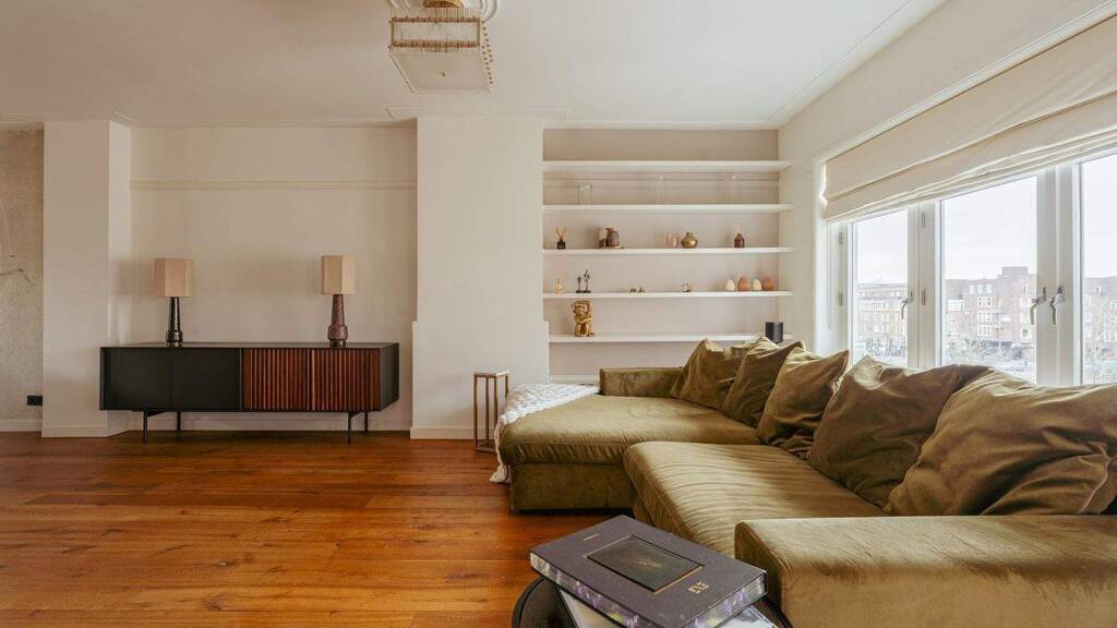 the spacious living area forms the heart of the apartment: an impressive l-shaped living room extending from the front to the rear of the property. large windows at the front provide beautiful natural light. french doors open onto a charming balcony with open views over the lively stadionplein. the generous layout offers various possibilities for furnishing and arrangement.