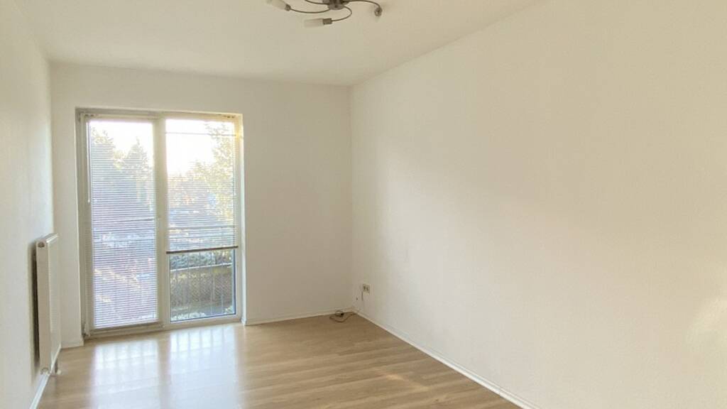 Die Wohnung verfügt über ein geräumiges Wohnzimmer mit bodentiefen Fenstern und einem Ausgang zum Balkon. Der Balkon ist nach Westen ausgerichtet und bietet einen Blick über die Gärten der Nachbarschaft. Die zwei Schlafzimmer haben ebenfalls bodentiefe Fenster. Alle Zimmer sind mit Laminatboden ausgelegt. Vom Wohnungsflur gehen Küche und Bad ab. Das Badezimmer ist türhoch gefliest und hat eine eingeflieste Badewanne, ein Waschbecken und ein wandhängendes WC.