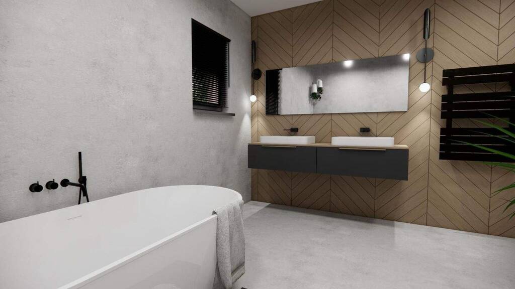 Badezimmer komplett ausgestattet mit: - Wand- und Bodenfliesen - WC-Vorwandelement - Waschbecken - Duschecke oder Badewanne (je nach Wunsch) - Armaturen für Dusche und Waschbecken - Duschkopf - Fenster & Türen - Kunststofffenster mit Dreifachverglasung für hervorragende Wärmedämmung - Weiße Kunststoff-Eingangstür, robust und pflegeleicht