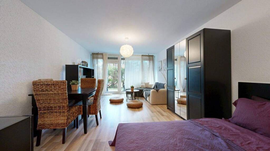 Diese gepflegte 1-Zimmer-Wohnung im Erdgeschoss überzeugt durch eine kompakte und zugleich durchdachte Raumaufteilung sowie ein besonderes Plus an Lebensqualität, einer Terrasse mit angrenzendem Grünstreifen. Der großzügige Wohn- und Schlafbereich bildet den zentralen Lebensmittelpunkt der Wohnung und bietet ausreichend Platz für eine klare Trennung von Wohn-, Schlaf- und Arbeitsbereich. Die bodentiefen Fenster sorgen für angenehme Helligkeit und schaffen eine freundliche Wohnatmosphäre.
