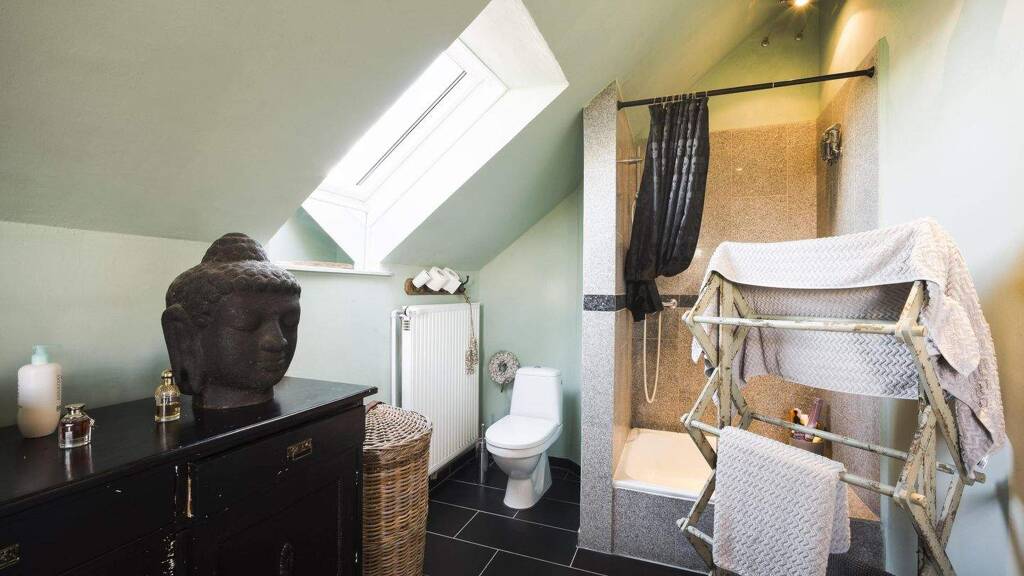Das Vollbad überzeugt mit viel Licht und dem bewährten Mix aus moderner Technik und zum Beispiel Messingarmaturen historischen Anscheins.