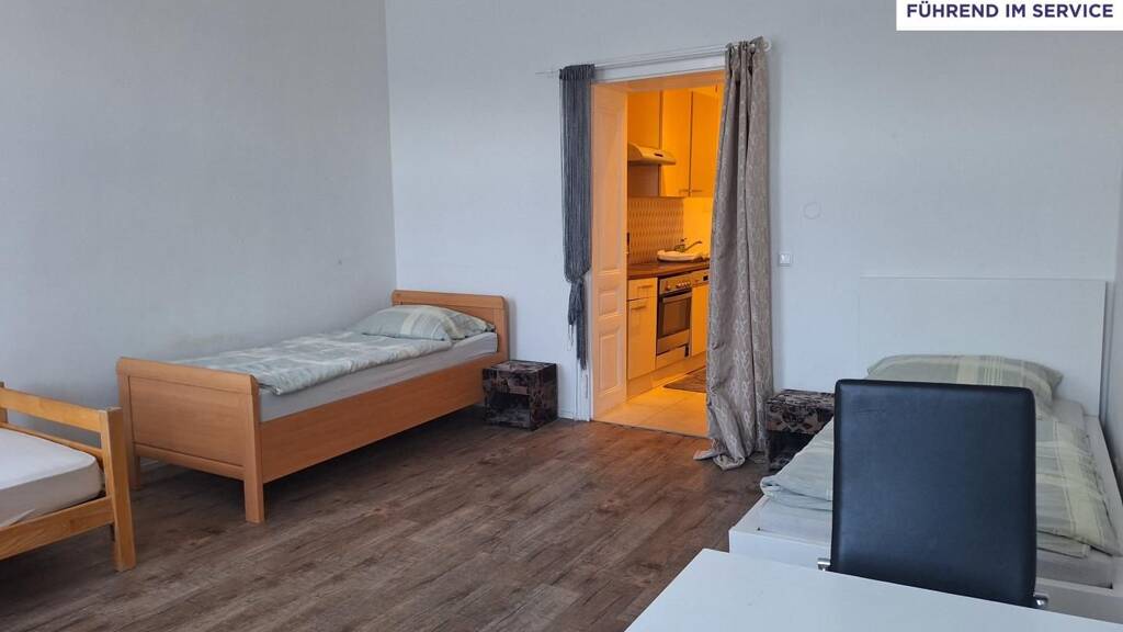 Vom Eingang aus betreten Sie direkt die Küche, die den zentralen Mittelpunkt der Wohnung bildet. Von der Küche aus gelangen Sie einerseits in das Wohn-/Schlafzimmer und andererseits in das Badezimmer mit Dusche und WC.