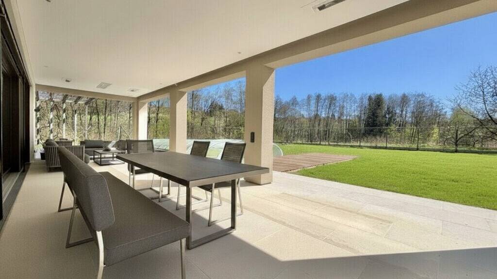 Der Außenbereich verwandelt sich in eine private Wohlfühloase: Ein großzügiger Pool (ca. 10 x 4 m) mit Wärmepumpe, Außendusche, stilvolle Loungebereiche laden zum Entspannen ein. In den Decken integrierte Heizstrahler ermöglichen auch an kühleren Tagen angenehme Stunden im Freien. Der Garten mit Altbaumbestand (Obstbäumen wie Walnuss-, Himbeer- und Kornelkirschenpflanzen etc. ) schafft eine natürliche Atmosphäre und bietet Raum für Erholung und Genuss.