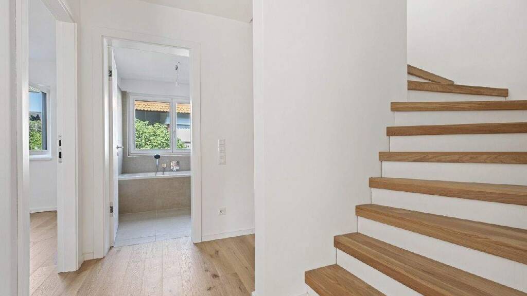 Elegante Parkettböden in allen Wohn- und Schlafräumen, Innentüren weiß matt mit Holzzarge bzw. Glastüren, großzügige Terrasse im Erdgeschoß mit Kaltwasseranschluss und Außenbeleuchtung, Terrasse im Dachgeschoß mit beeindruckender Aussicht, großformatige Fliesen (60 x 60 cm) in den Sanitärbereichen, Badewannen mit Markenarmaturen, bodenbündige Duschen, sämtliche Häuser werden vollständig mit Raffstores ausgestattet und noch vieles mehr...