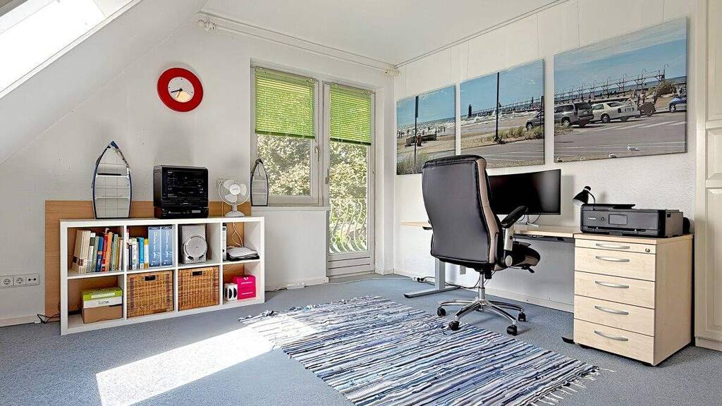 Insgesamt verteilen sich mehrere flexibel nutzbare Zimmer auf den beiden Hauptwohnebenen. Das Schlafzimmer en suite im Dachgeschoss verfügt über ein elegantes Bad sowie einen eigenen Balkon mit herrlichem Blick in den Garten. Ein ausgebauter Dachboden bietet zusätzliche Spiel- oder Schlafmöglichkeiten, perfekt für Kinder oder Gäste.