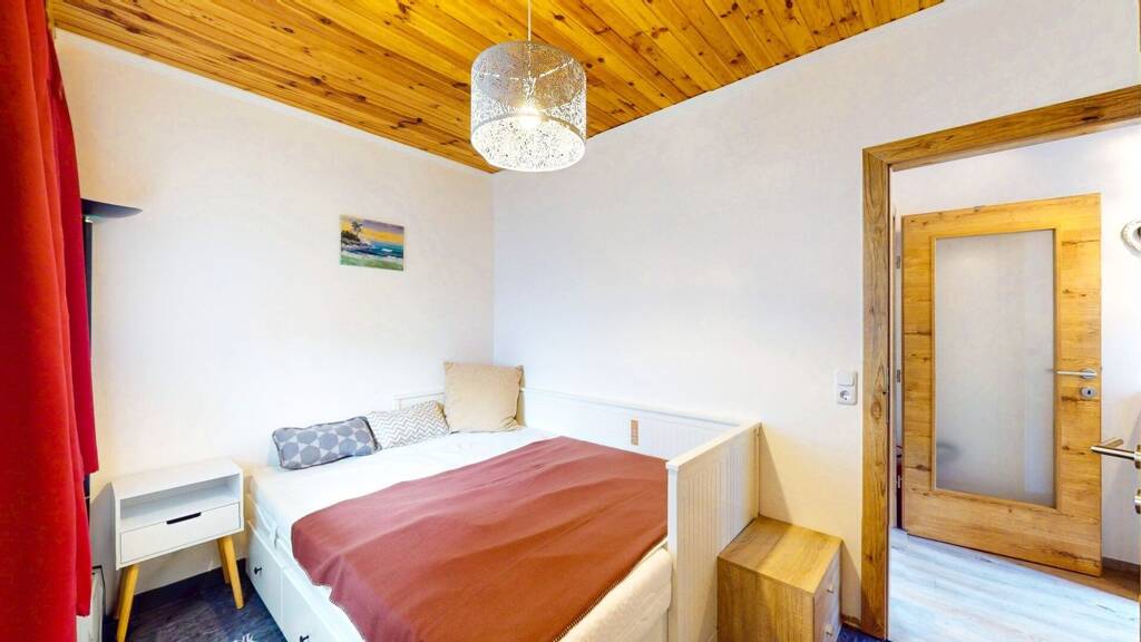 Der offene Wohn- und Essbereich ist lichtdurchflutet und führt direkt in die Küche, auf die Terrasse und in das zweite Schlafzimmer. Die gemütliche, rustikale Essecke, ein zeitloses Sofa und ein Specksteinofen schaffen eine behagliche Atmosphäre; bodentiefe Fenster ermöglichen den direkten Blick und Zutritt in den Garten. Die Küche ist vollständig ausgestattet und in ansprechender Holzoptik ausgeführt - ideal für private Nutzung oder Feriengäste. Alle Türen im Erdgeschoss sind in hochwertiger Holzoptik mit Edelstahl-Türgriffen; der gesamte Fußbodenbereich ist mit einem edlen Holzbelag versehen, wodurch ein stimmiges Gesamtbild entsteht.