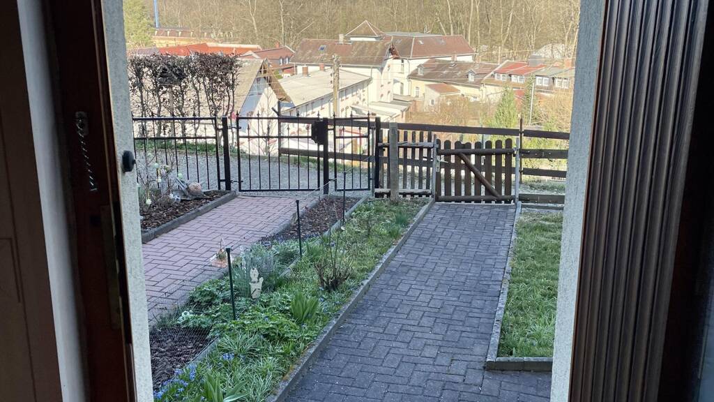 Das pflegeleichte Grundstück verfügt über einen Vorgarten mit Terrasse und Fernblick sowie einen befestigten Innenhof. Parkmöglichkeiten sind in der Umgebung vorhanden.