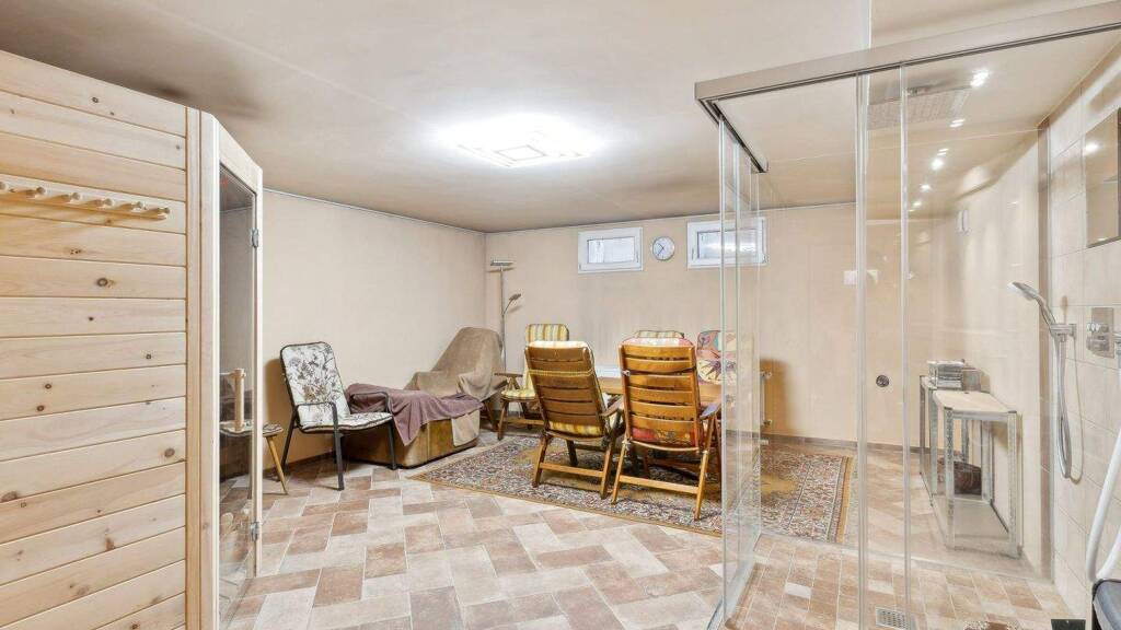 Über einen breiten Treppenabgang gelangt man in den Kellerbereich, der weit über klassische Nutzflächen hinausgeht. Neben den Technik- und Waschräumen stehen mehrere wohnraumähnliche Flächen zur Verfügung, darunter ein großer Abstellraum, ein Sportraum sowie ein separater Wellnessbereich mit Sauna und Dusche. Diese Flächen bieten zusätzlichen Komfort und vielfältige Nutzungsmöglichkeiten.