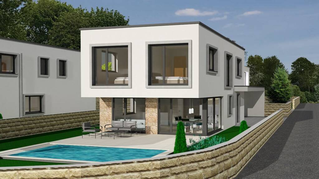 Bei diesem Objekt handelt es sich um ein projektiertes Einfamilienhaus in einer der schönsten Ferienregionen Kroatiens. Als Eigennutzer oder auch als Ferienvermieter kommen Sie hier jederzeit auf Ihre Kosten. Mit einer maximalen Belegungszahl von 6 Personen (mit Schlafsofa im Wohnzimmer 8 Personen), findet auch die Großfamilie oder die kleine Reisegruppe ihren Platz. Moderne Architektur, werterhaltende qualitative Massivbauweise, ein eingefriedetes und geschmackvoll angelegtes Grundstück mit herrlichem Pool direkt von der Gartenterrasse zugänglich und eine geräumige Doppelgarage inklusive Hauseingangsüberdachung runden das umfangreiche Angebot ab.