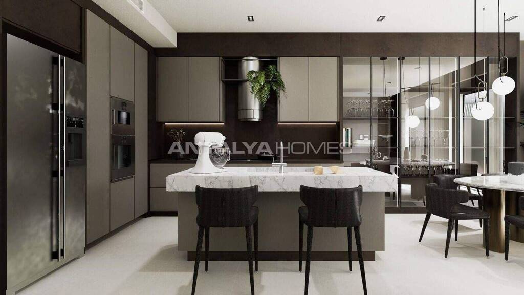 Die 3-stöckigen Häuser bieten 6 Schlafzimmer mit einer Bruttofläche von 490 m² und einer Netto-Wohnfläche von 290 m². Die Innenräume sind großzügig gestaltet und verfügen über Fußbodenheizung, Klimaanlagen-Infrastruktur, Smart-Home-Systeme, Einbauküchengeräte mit Insel-Layout, intelligente Rollläden, große Terrassen, begehbare Kleiderschränke und helle Wohnbereiche. Diese Häuser verbinden Komfort, Funktionalität und modernes Wohnen an einem der vielversprechendsten Standorte Antalyas.