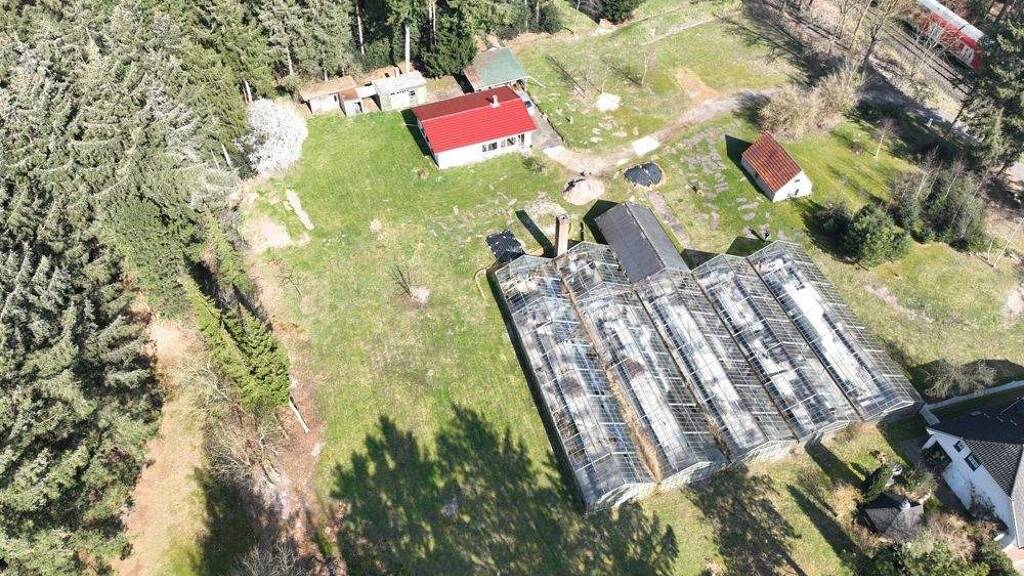 Die Erschließung durch Strom, Wasser und Anschluss an die öffentliche Grundstücksentwässerung sind gegeben. Die soliden aus feuerverzinktem Profilstahl bestehenden Gewächshäuser mit ca. 600 Quadratmetern überbauter Fläche sind fast geräumt. Die Heizungsanlage ist schon sehr lange außer Betrieb. Auf dem Grundstück gibt es eine neue Stromhauptverteilung. Das Wohnhaus hat bereits ein neues Dach mit Isolierung erhalten. Das einfache Duschbad ist in Betrieb und ein Schornstein ist für einen Anschluss parat! Ein gemauertes Nebengebäude dient als Holzlager. Das Waldgrundstück ist mit seinen Bäumen und Sträuchern ein Paradies für die Tierwelt. Eichhörnchen und Vögel erfreuen den Spaziergänger auf dem eigenen Grundstück. 6924 Quadratmeter Grundstück mit Bebauung und Stellflächen 10723 Quadratmeter Wald