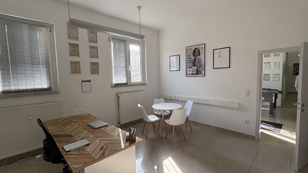 Die Mietfläche umfasst vier separate Büroräume, einen großzügigen Besprechungsraum sowie einen weitläufigen Eingangsbereich mit zwei separaten Zugängen. Ergänzt wird das Raumangebot durch eine funktionale Teeküche und zwei getrennte Sanitärbereiche.