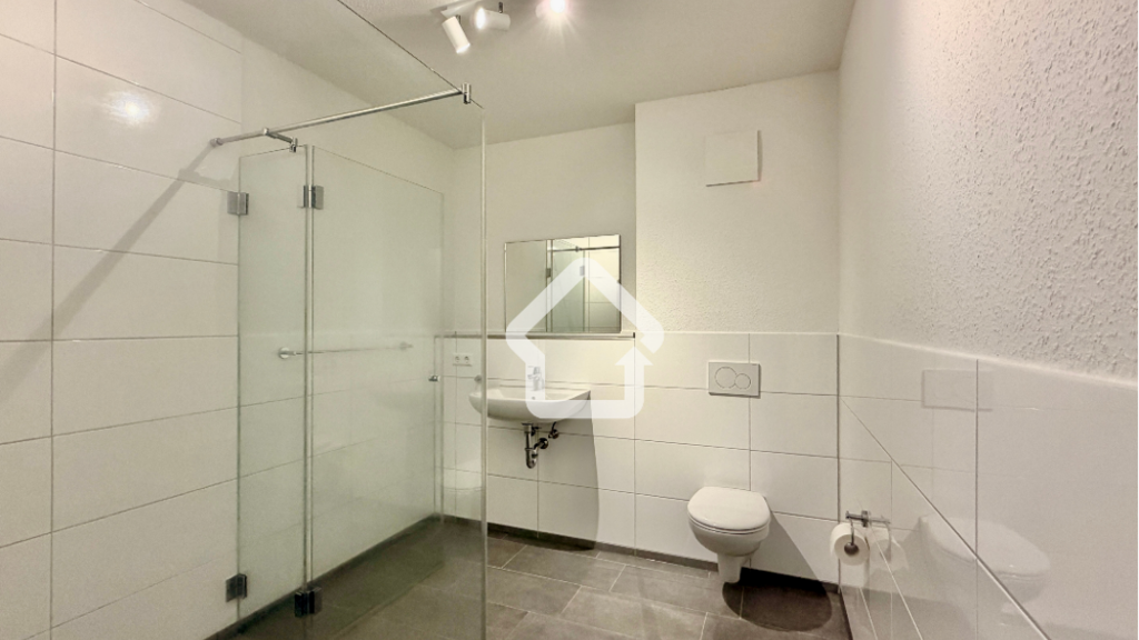Ein besonderes Highlight ist das komfortable Badezimmer mit modernen sanitären Elementen und einer bodengleich installierten Dusche, die für ein elegantes und barrierearmes Design sorgt.